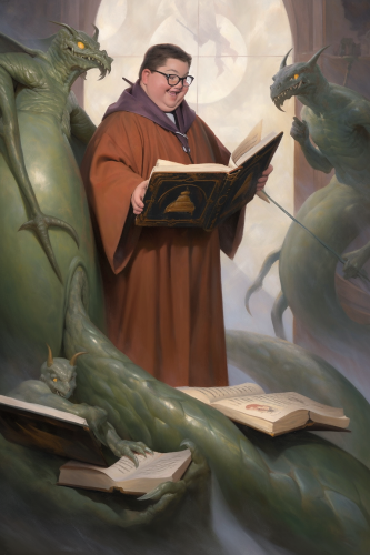 Beautiful Oil Painting from a Dungeons and Dragons adventure, featuring a close shot of a slightly overweight wizard, looks like Dennis Nedry from Jurassic Park, he is in his 30’s, short brown hair, he wears olive green robes, full body standing, he loves old books, he is reading, he is laughing, he is overconfident in his meagre skills, he is annoyingly smug, in the style of Eric Belisle and Todd Lockwood, lots of books stacked around him, cavern in background, hyper detailed face, realistic, cinematic light, magical light, rim light, dynamic movement in drawing, expressive strokes, blotchy, broad strokes, 8K --ar 2:3 --niji --no beard