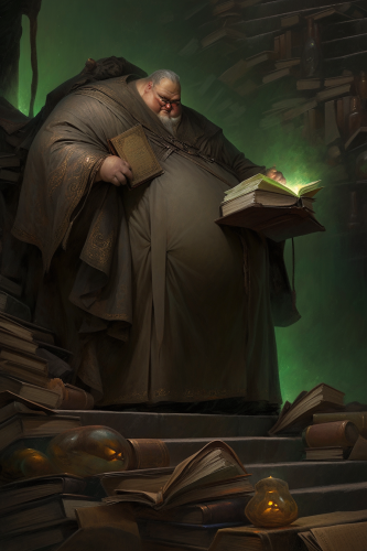 Beautiful Oil Painting of a fat wizard, looks like Peter Kay, green robes, from a Dungeons and Dragons adventure, full body standing, he loves old books, he is reading, stupidly grinning, in the style of Eric Belisle and Todd Lockwood, books stacked in a cavern in background, hyper detailed, cinematic light, magical light, rim light, dynamic movement in drawing, expressive strokes, blotchy, broad strokes, 8K --ar 2:3 --niji