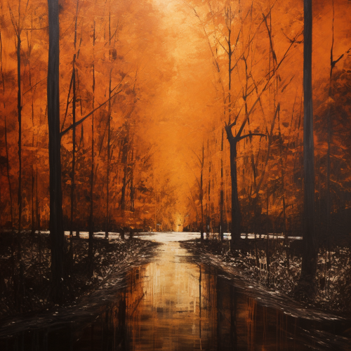 a painting about a forest with a road down the middle during fall with orange and black trees