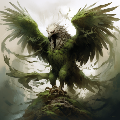 dnd painterly concept illustration, giant eagle with wings spread, talons bared, green seaweed fringe at bottom of wings, green eyes, hostile expression