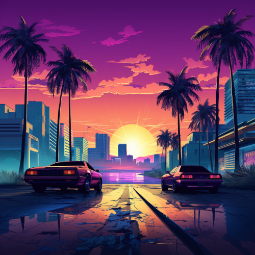 GTA vice city in the style of acrylic painting by nick johnson, synthwave style, golden age aesthetics, vintage aesthetics, 32k uhd, pixelated