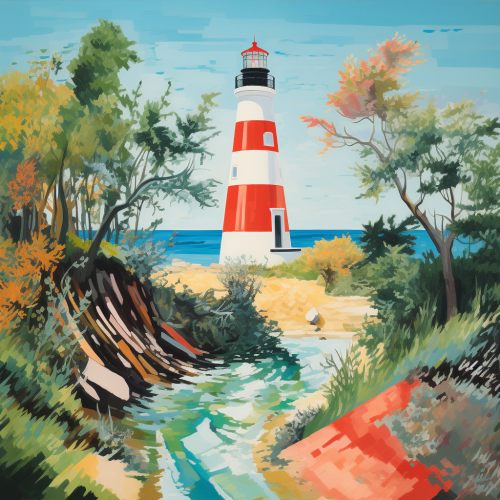 a David Hockney landscape painting of a lighthouse surrounded by different trees, visible brushstrokes