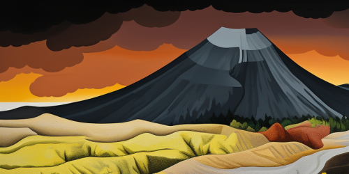 an old extinct inactive volcano in Iceland, conquered by moss and lichen, a gradient of colors from yellow, orange, red. Fibonacci sequence Stormy weather, rainy day theme colors, gradients of grey to black colors. In the style of Rob gonsalves + Magritte + Manet + Igor Morsky. High contrast of colors. Hyper-realistic, High contrast of colors. 64K. HD, Ultra-Wide Angle, Depth of Field. Octane render, Intricate details. hyper-realistic, no signature, no label. Octane render, Intricate details. hyper-realistic, no signature, no label. --ar 64:32 --v 5.2