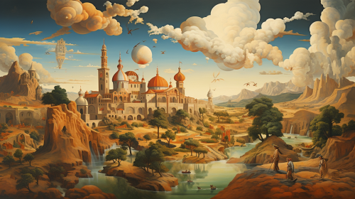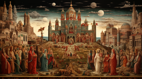 Italian medieval art, religious themes, general depiction of biblical parables, Italian color palette with a slight emphasis on red over green, diverse colors, highly detailed, 64k, --ar 16:9