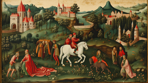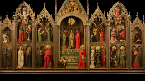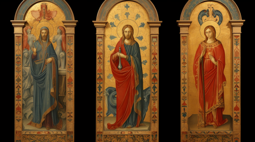 Italian medieval art, religious themes, exclude church frames, Italian color palette with a slight emphasis on red over green, diverse colors, highly detailed, 64k, --ar 16:9