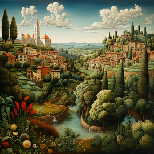 Italian medieval art, religious theme ::1 , fresco, Christian iconography ::0.8 , Tuscan landscape ::0.7 , Italian color motifs, vibrant reds, deep greens, golden yellows, azure blues ::0.6. --ar 16:9