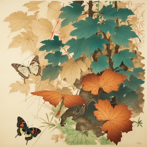 A painting composed of at least three different kinds of leaves (such as maple leaves and Gingko biloba leaves) , with shape as the main, objective modeling, butterfly --v 5.0