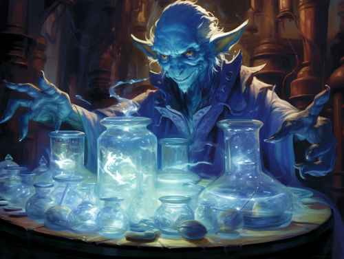 A small homunculus perched on an alchemical table, surrounded by vials and flasks filled with aetherial substances. The creature emanates magical prowess. Highlight the homunculus as a creation of ancient alchemy, with a focus on the infusion of aetherial energy. MTG card art. blue lighting. painting. detailed. --ar 4:3