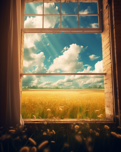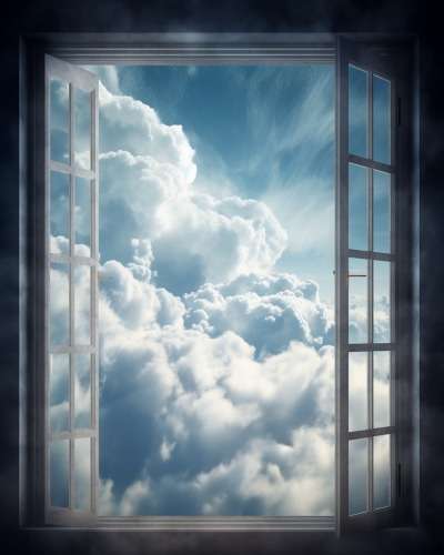 there is a sky with clouds, it look like a painting , and in the middle there is a medium open window 4k, HD, Clear Image --ar 4:5 --v 5.1 --stylize 250