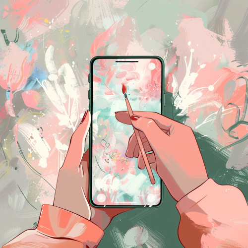 the brush of a person who presses on the smartphone screen, a design in the style of the bloom crypto app, a painted illustration, a minimum of details --v 6.0