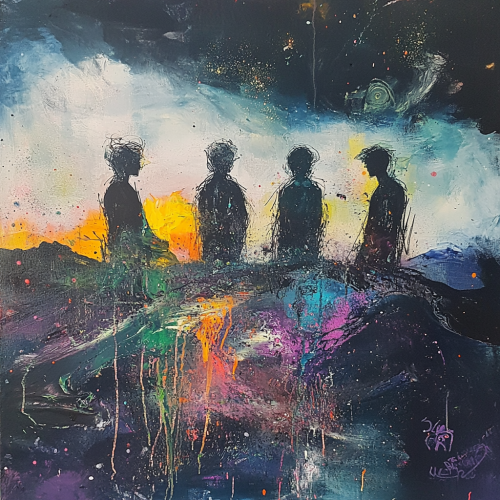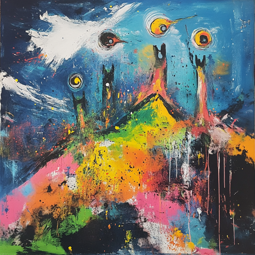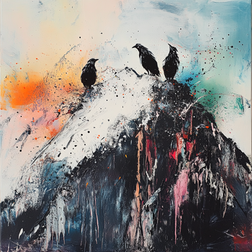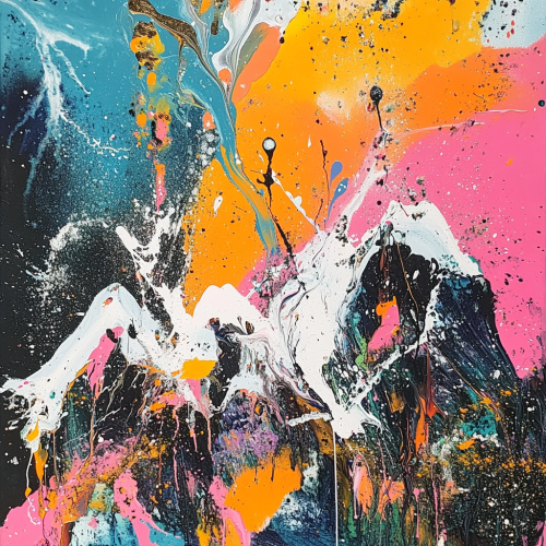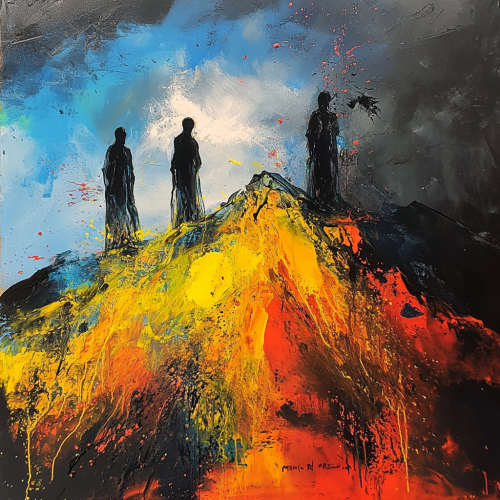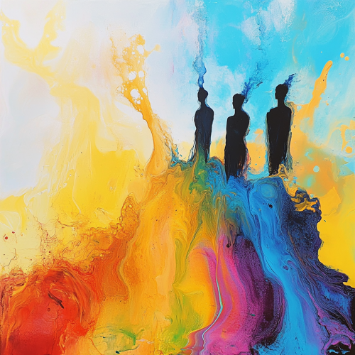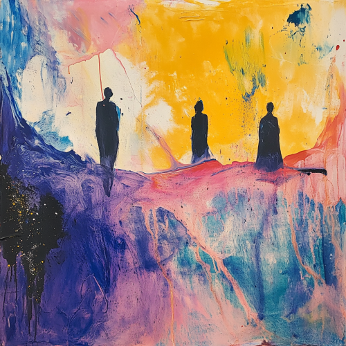 completely abstract painting with accrylic paint pour and splatter and brush strokes with subject matter three spirits looking over a mountain in the style of Ludovic Dervillez