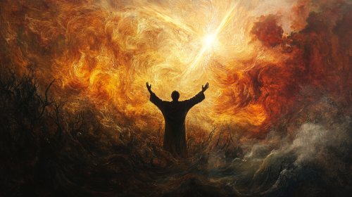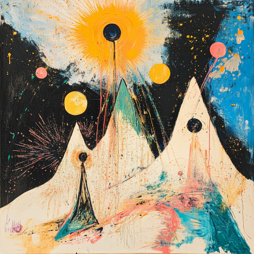 completely abstract painting with accrylic paint pour and splatter and brush strokes with subject matter three spirits looking over a mountain in the style of Wassily Kandinsky