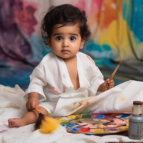create a cartoon of a cute 6-months baby Indian girl dressed as a Painter with a brush in hand, painting elements in the background on a white bed sheet background, sitting on the bed, Photoshoot, Studio lighting, top angle shot