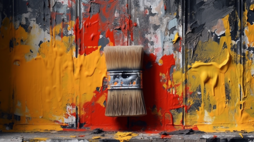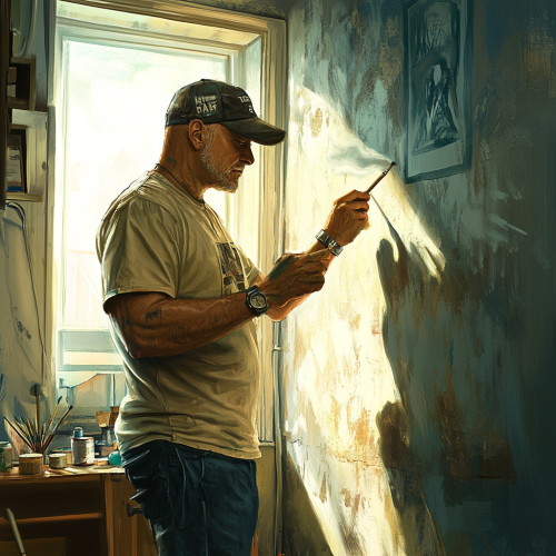 A bald man with a small beard is painting the walls of his cozy, modest living room. He’s wearing a cap, a simple t-shirt, and jeans, with a watch on his wrist. The room is filled with the smell of fresh paint as he carefully brushes color onto the walls. He pauses occasionally to take a puff from a spliff, exhaling smoke that mingles with the paint fumes. The room is small, with worn but comfortable furniture, and the light from a nearby window casts a warm glow over the scene.