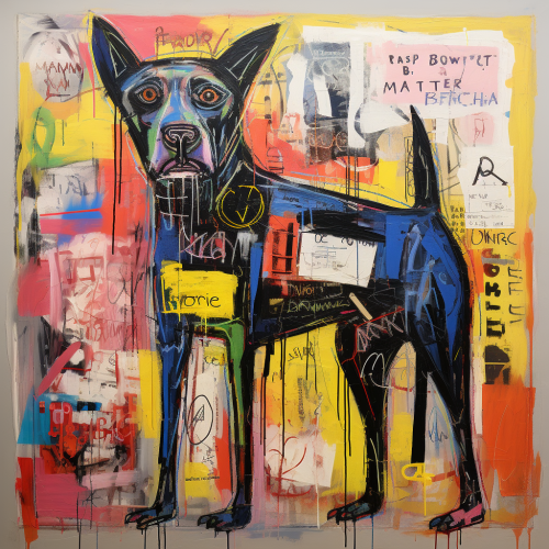 Basquiat’s poetic boxer dog, an expressionist portrait, high-contrast vivid colors, fragmented anatomy mixed with graffiti text, a raw expression of the canine soul, 4k –ar 4:2 –v 5 –q 2 --s 250