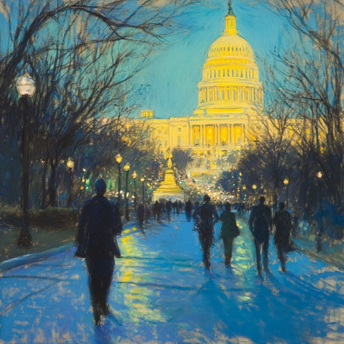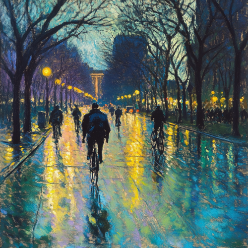 Pintura impressionista pastel e grafite de Frank weston benson numa cena em Washington DC em um dia ensolarado com varios ciclistas na rua. Tinta encáustica a óleo, azul e neon fluo amarelo e verde e linogravura turquesa elétrica. árvores secas com galhos longos e secos. sombras das pessoas no chão são compridas