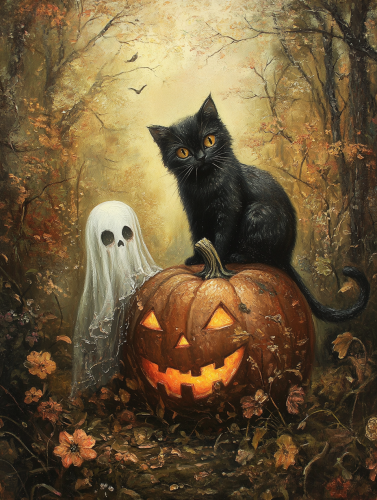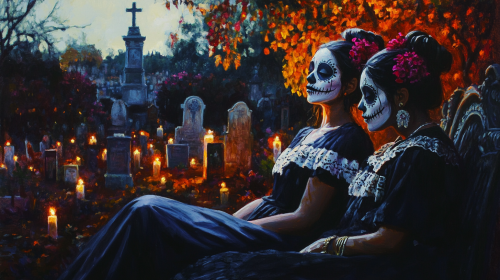 An oil painting of two indigenous Mexican woman in the foreground, they are sitting on a grave on the traditional night of the dead and wearing catrina makeup. It is nighttime but the light from the candles is enough to illuminate the bougainvillea hanging in the corner. In the background you can see the cemetery filled with candle lights + mexican art style + oil painting + --ar 16:9