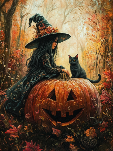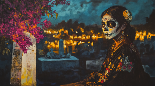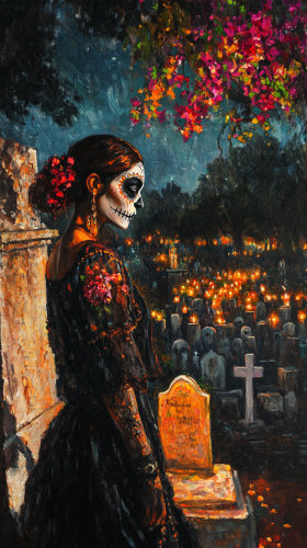 An oil painting of an indigenous Mexican woman in the foreground, she is walking besides a grave on the traditional night of the dead and is wearing catrina makeup. It is nighttime but the light from the candles is enough to illuminate the bougainvillea hanging in the corner. In the background you can see the cemetery filled with candle lights + mexican art style + oil painting + --ar 9:16