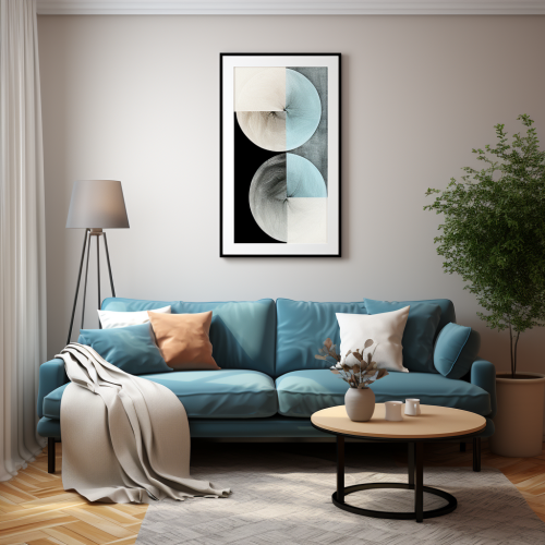picture in black frame, abstraction, circle from two parts, gradient, blue, white. --s 750