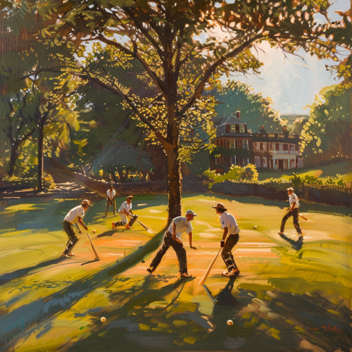 Depict the timeless elegance of cricket in an oil painting, focusing on a serene village green where players are engaged in a leisurely game, with the afternoon sun casting long shadows, using detailed brushstrokes and warm, earthy tones to convey the tradition, camaraderie, and nostalgic charm of cricket." Best Art Style: Pastoral Realism with Warm, Earthy Tone --v 6.0