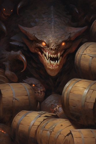 Beautiful Dungeons and Dragons Reference Oil Painting, in the style of Eric Belisle, Todd Lockwood, featuring a long shot of a ONE EYED Nothic, looks like a dark fantasy CYCLOPSE, cyclopean, reptilian scaly skin, mouth with sharp teeth, grinning, he has arms and legs, he is sat in a cavern surrounded by stacks of books, he is in full view, dramatic angle shot like a Peter Jackson movie, cinematic lighting, rim lighting, studio lighting, magical lighting, highest detail, intrinsic detail, alla prima, impasto, precise details, epic, intricate, masterpiece, expressive strokes, rough, blotchy, Disney style, 8K --niji --ar 2:3