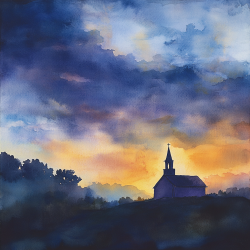 Background: water color painting, A gradient sky transitioning from dawn to dusk, symbolizing the passage of time and daily reflection. Imagery: Silhouettes of a church steeple or the outline of a peaceful countryside chapel under a serene sky, with soft beams of light breaking through the clouds. Color Scheme: Soft blues, purples, and hints of gold or orange, reflecting the colors of a morning or evening sky, adding a tranquil and hopeful tone.