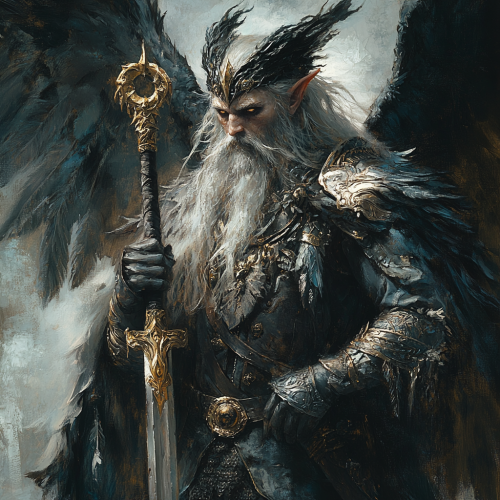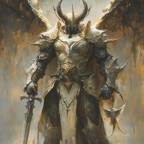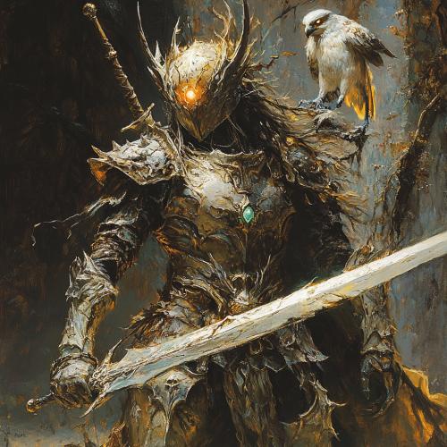 Male elf monster with a third eye and extremely long arms and legs full of sprouting spikes and horns forming a carapace, long spiky ears, long dark hair, light armor and helmet, terrifying and deformed monster, paladin, holding a sword and a banner of a hawk holding a sword, oil painting, epic --s 250