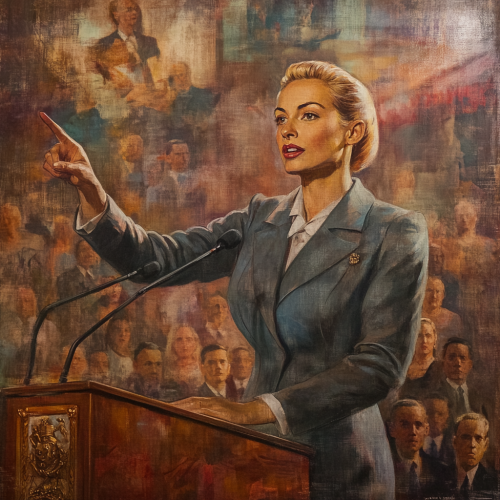 A Renaissance painting of an iconic Eva Duarte Peron wearing an elegant suit giving her speech at the podium in front of people, she is pointing to something on stage with one hand while speaking into a microphone held up by someone beside here. She has blonde hair pulled back tight behind her ears. In background we see blurred out-of-focus images of a few people