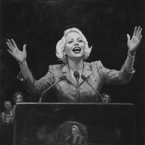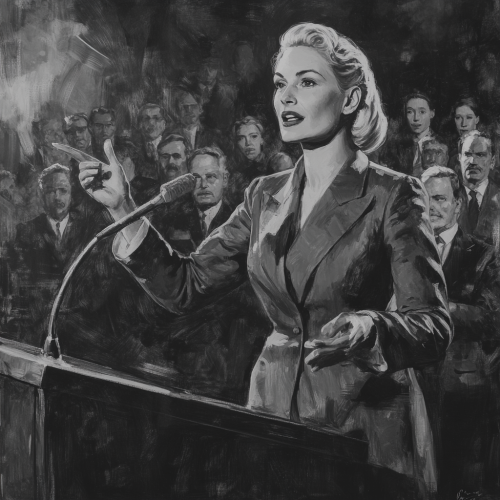 A draft of an old black-and-white photograph from the early 1960s, depicting Eva Peron giving a political speech with blonde hair in her 40, smiling while waving her arms on stage. oil-painting, 4K