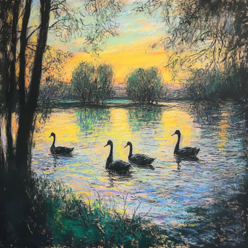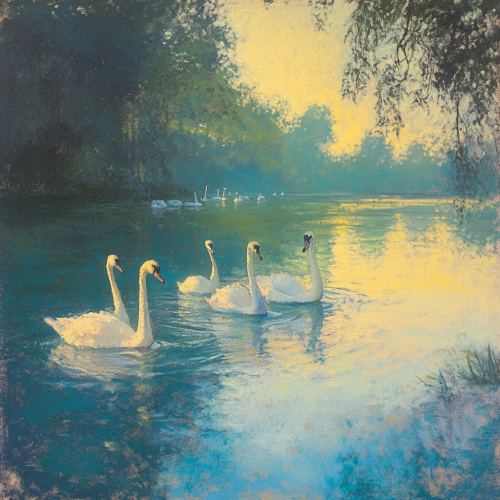 Pintura impressionista pastel e grafite de Frank weston benson numa cena em um dia ensolarado com varios cisnes nadando num lago. Tinta encáustica a óleo, azul e neon fluo amarelo e verde e linogravura turquesa elétrica. árvores secas com galhos longos e secos.
