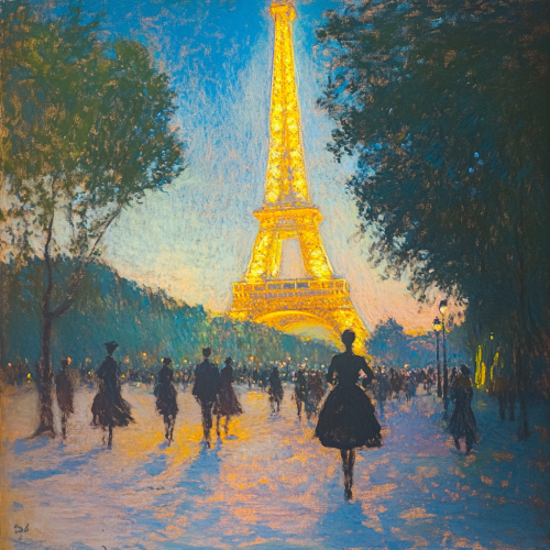 Pintura impressionista pastel e grafite de Frank weston benson numa cena na frança em um dia ensolarado, pessoas andando em frente a Torre Eifel . Tinta encáustica a óleo, azul e neon fluo amarelo e verde e linogravura turquesa elétrica. árvores secas com galhos longos e secos. sombras das pessoas no chão são compridas