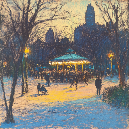 Pintura impressionista pastel e grafite de Frank weston benson numa cena em Nova York em um dia ensolarado, criancas brincando no play ground no parque . Tinta encáustica a óleo, azul e neon fluo amarelo e verde e linogravura turquesa elétrica. árvores secas com galhos longos e secos. sombras das pessoas no chão são compridas*