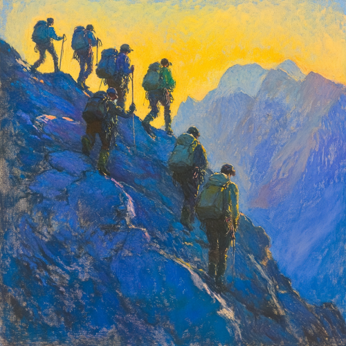 Pintura impressionista pastel e grafite de Frank weston benson numa cena em um dia ensolarado com varios alpinistas escalando uma pedreira. Tinta encáustica a óleo, azul e neon fluo amarelo e verde e linogravura turquesa elétrica. árvores secas com galhos longos e secos. sombras das pessoas no chão são compridas
