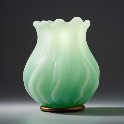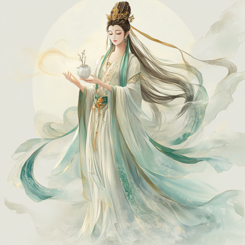 Create a serene and elegant depiction of Guanyin, inspired by the reference image. Guanyin is depicted as a graceful figure with a calm and compassionate expression. She is dressed in flowing, luminescent robes that shimmer with soft pastel hues, primarily in shades of white and light blue, with intricate gold and green detailing along the edges. Her long, dark hair is styled neatly, adorned with a small, ornate headpiece or crown. In one hand, she holds a delicate vase, symbolizing purity and grace, while in the other, she gently grasps a bamboo branch, representing resilience and peace. Ethereal, flowing ribbons of energy swirl around her, adding a mystical and divine quality to the scene. The background is minimalist, featuring soft light, subtle lanterns, or abstract elements that enhance her divine presence, creating an atmosphere of tranquility and reverence. clean background white or couldy