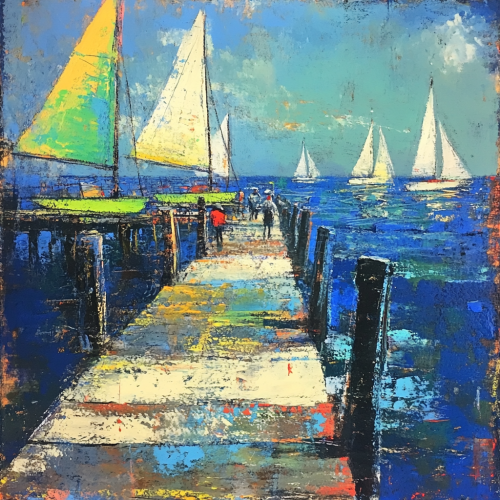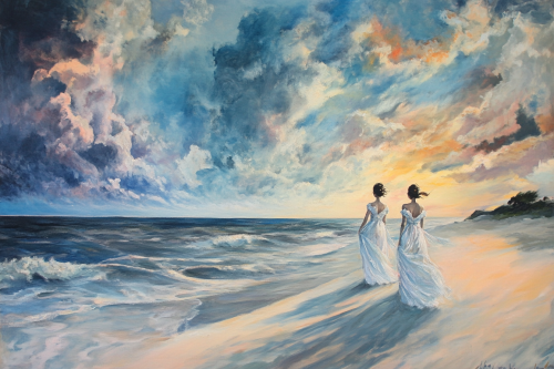 An hyperrealist contemporary painting by Turner depicting coastal seaside with tormented blue sky with various clouds and colorful hues. Sunrise. In the foreground on the beach, 2 glamour women with slim curves and glamour dress painted in the style of Caillebotte and Manet. --ar 3:2