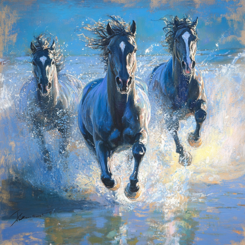 Pintura impressionista pastel e grafite de Frank WEston Benson de uma cena de corrida de 3 cavalos selvagens nas orlas da praia dentro da agua , dia ensolarado. tres cavalos correndo em alta velocidadade , aguas espumando. Tinta encáustica a óleo, azul e neon fluo amarelo e verde e linogravura turquesa elétrica.