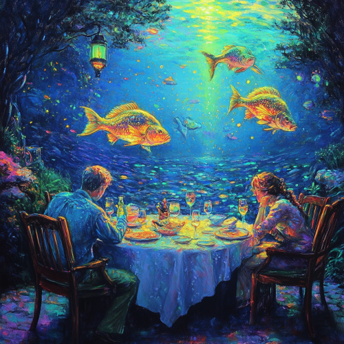 Pintura impressionista pastel e grafite de Thomas Kinkade numa cena alguns peixes coloridos lindos no fundo mar. Tinta encáustica a óleo, azul e neon fluo amarelo e verde e linogravura turquesa elétrica