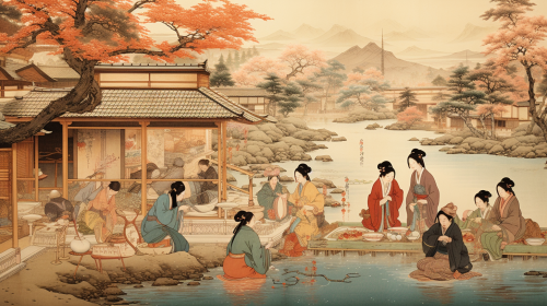typical Japanese ukiyo art, scene depicting daily life, highly detailed, 64k, --ar 16:9