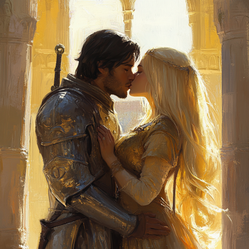 Knight in shining armor kissing a Blonde aryan roman goddess woman. Sunny day. Golden light. Ancient civilization ambience. Arabic aesthetic. mosque. oil painting, Lots of grain, cinematic, high resolution, ultra detailed.