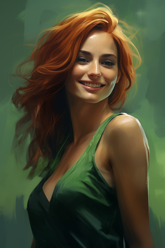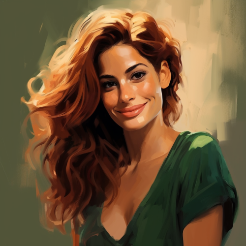 Latina Julia Roberts with green hair, dimples, green 009638, in the style of digital painting, rich tonal palette, realistic lighting, brushwork exploration, amber, caricature-like illustrations, i can't believe how beautiful this is, --ar 2:3