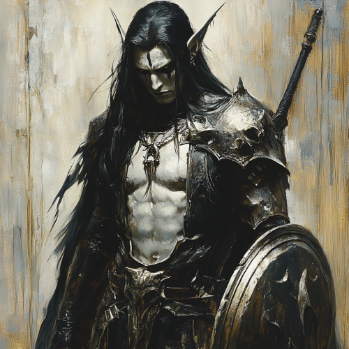 Male slender elf with grey chalk skin and bulging black veins, pointy ears, black rock carapace, long black hair, third eye on his forehead, light leather armor with parts of steel, holding a long sword and shield, monstrous, oil painting, black eyes --s 250
