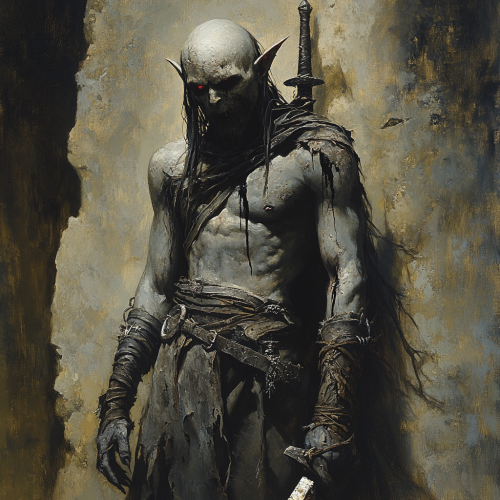 Monster,slender and malnourished elf whit long pointy ears and chalk grey skin, third eye, eyes covered by a bandana ,pitch black oily tears rolling on his face, strangely long legs and arms, leather armor with a fell metalic parts,holding a sword and a shield, rocky obsidian spikes on his skin and body, scarry and deformed horror creature, rpg character, elf, oil painting, full body portrait --s 250