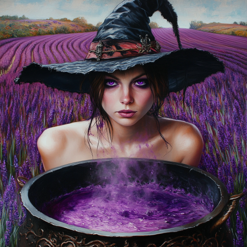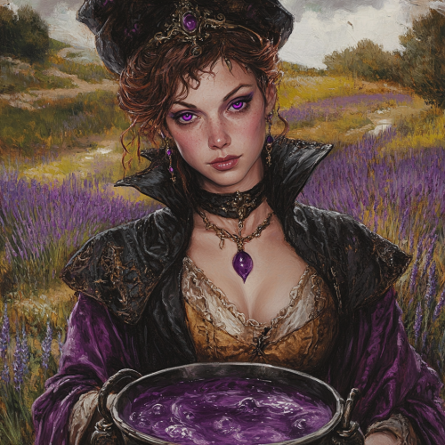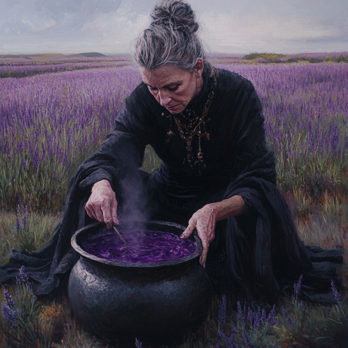 a medieval witch, 50 years old, purple concoction in a cauldron, hair in a bun, lavender field in background, grainy artwork, realistic fantasy painting, portrait