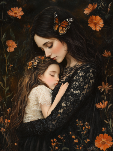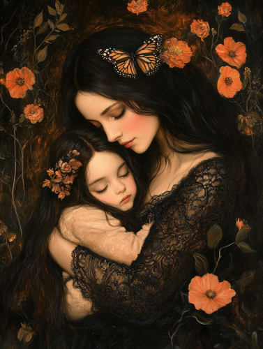 Pre-Raphaelite style painting of a mother and daughter embracing. Dark, romantic atmosphere. Mother with long dark hair wearing black lace dress. Sleeping child with long hair in her arms. Floral elements surrounding them, including orange cosmos flowers. Intricate details in clothing and jewelry. Soft, warm skin tones. Dark background with subtle plant motifs. Butterfly hair accessory. Delicate, emotive facial expressions. Rich, deep color palette dominated by blacks and warm earth tones. Oil painting texture. Chiaroscuro lighting effect. --ar 3:4 --v 6.1