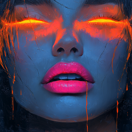 neon outline on black, neon colors, Close up portrait, impasto technique, low angle, detailed eyes, detailed lips, gray gold and black accents, dripping paint, illustration, painting, poster, impressionist detail maximize --s 750