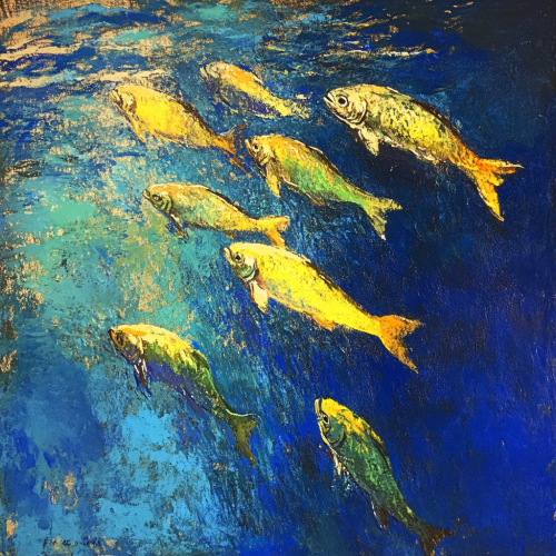 Pintura impressionista pastel e grafite de Frank weston benson numa cena alguns peixes coloridos lindos no fundo mar. Tinta encáustica a óleo, azul e neon fluo amarelo e verde e linogravura turquesa elétrica.