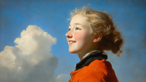 A nineteen-century painting depicting a 30-year-old woman with blonde hair, smiling in profile, wearing an orange jacket and black shirt underneath, against a blue sky background with white clouds in the upper left corner. The bright sunlight illuminates her face from behind, capturing a joyous expression. The soft lighting highlights her facial features in high resolution. --ar 89:50