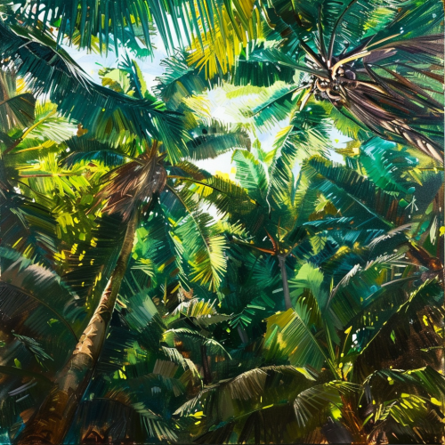 oil painting of a crowded arborium filled with well-dressed cyborg visitors, interior architecture style is a mix of ornate gothic detailing and arcology-inspired lush green walls and art-deco influences, rainy night lighting dark and cool colors, old-master oil painting with fine brushstroke detail + in the style of rembrandt --ar 16:9