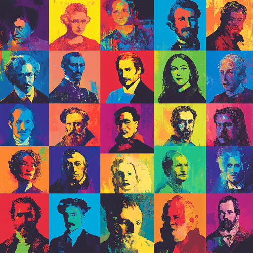 Create a vibrant, aesthetically pleasing digital art piece featuring 20 blocks, each dedicated to a famous artist: Vincent van Gogh, Pablo Picasso, Leonardo da Vinci, Claude Monet, Salvador Dalí, Henri Matisse, Frida Kahlo, Georgia O’Keeffe, Jackson Pollock, Edvard Munch, Andy Warhol, Paul Cézanne, Johannes Vermeer, Michelangelo, Edgar Degas, Pierre-Auguste Renoir, Wassily Kandinsky, Gustav Klimt, Mark Rothko, and Marcel Duchamp. Each block is a colorful silhouette of the artist, placed within solid square and rectangular frames. Use a modern and abstract style with bright, saturated colors. The overall layout should be grid-like, with the squares and rectangles of varying sizes forming a cohesive yet dynamic composition. The colors should be bold and complementary, creating a visually appealing mosaic-like effect.