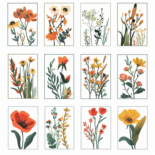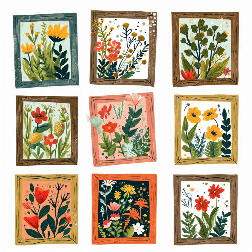 collection of floral painting in wooden frames cartoon style assets,minimal separated shapes,desaturated colors ,isolate on white background, --style raw --no photo-realistic, lights, shadows, outline --v 6.0